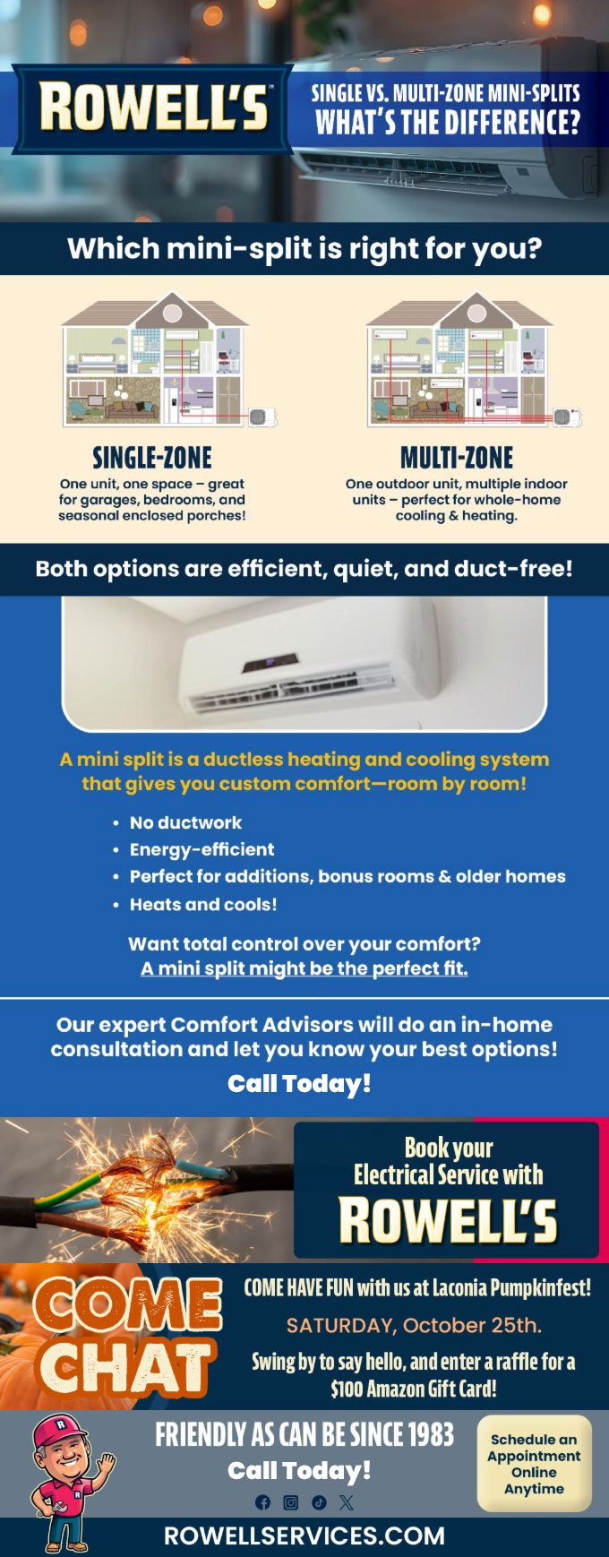 "Friendly As Can Be Since 1983!" When you need help with your plumbing, drains, heating, cooling or electrical in Nashua, you can always rely on Rowell's Services! Call us now or book online!